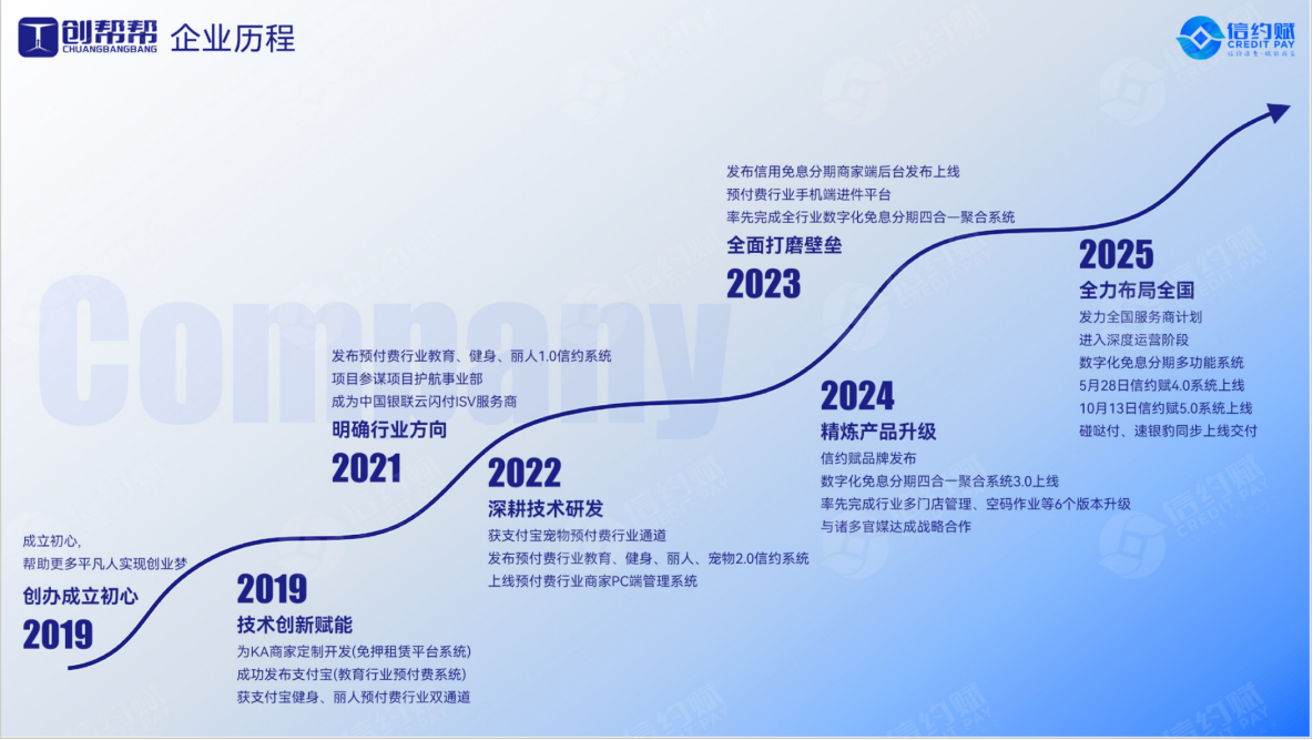 ·2024年 信约赋数字增收3.0新消费系统全面上线,信约赋更深度地赋能线下全行业商家,更安全、更智能、更高效地完成数字化门店转型。同时为信约赋全国合作伙伴增添壁垒,巩固市场地位,通过技术拉高行业门槛。至此,信约赋已构建了“信用评估--合约履约--风险管控--经营赋能”的全链路服务体系